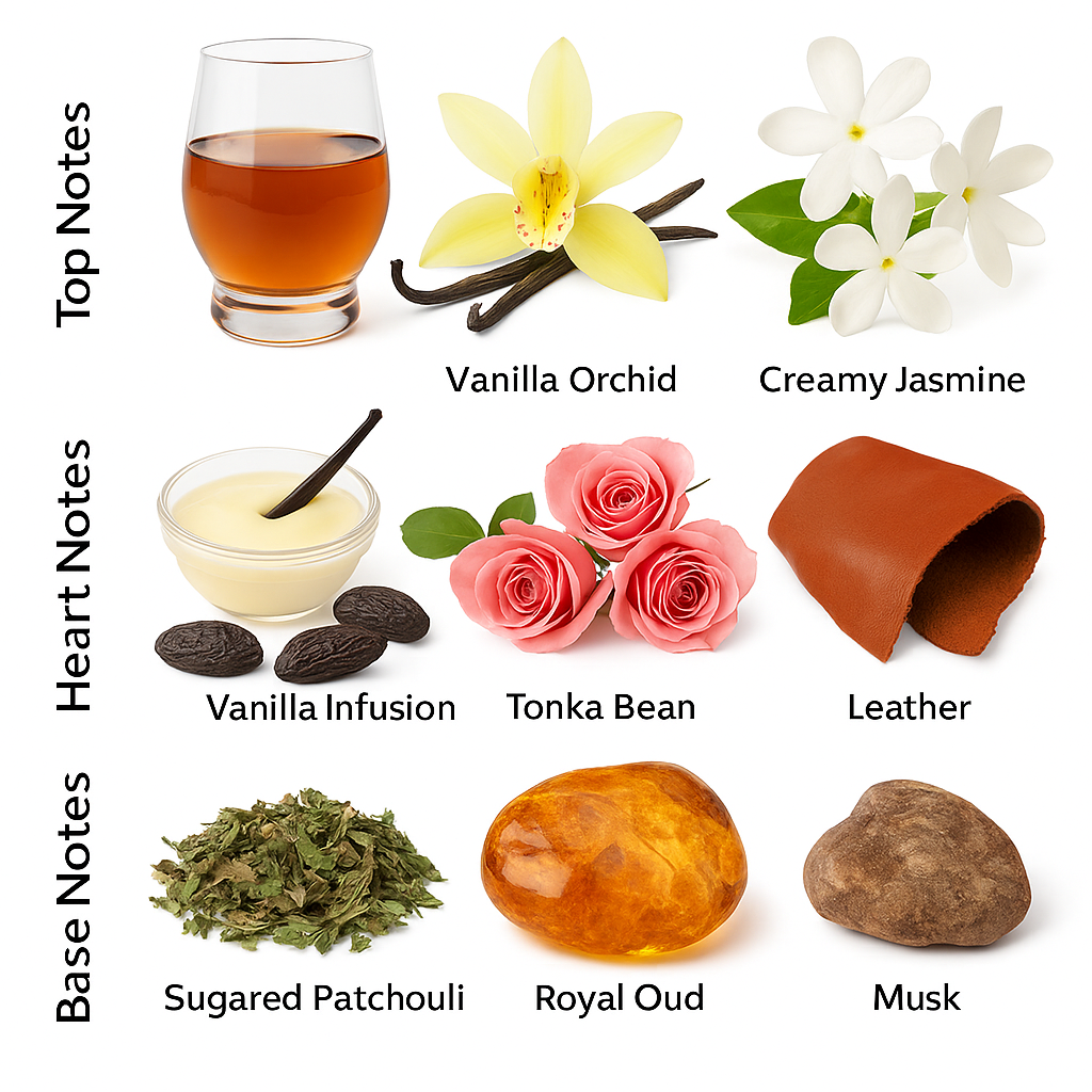 It opens with indulgent top notes of Golden Rum, Vanilla Orchid, and Creamy Jasmine, offering a rich and inviting start. The heart is a lavish mix of Vanilla Infusion, Tonka Bean, Rose Bouquet, Leather, and Crème Brulée—a balance of floral romance and creamy depth. The dry-down is powerful and captivating, anchored by Sugared Patchouli, Royal Oud, Amber, and Musk, leaving a smooth yet smoky signature trail.