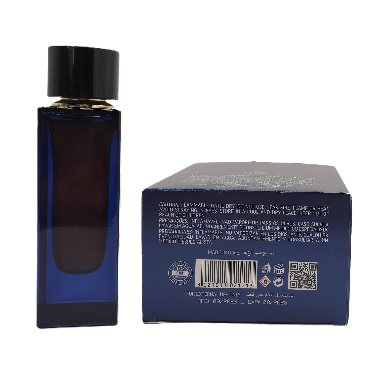 Bottle: Sleek navy blue glass bottle with gold swirl detailing and black cap