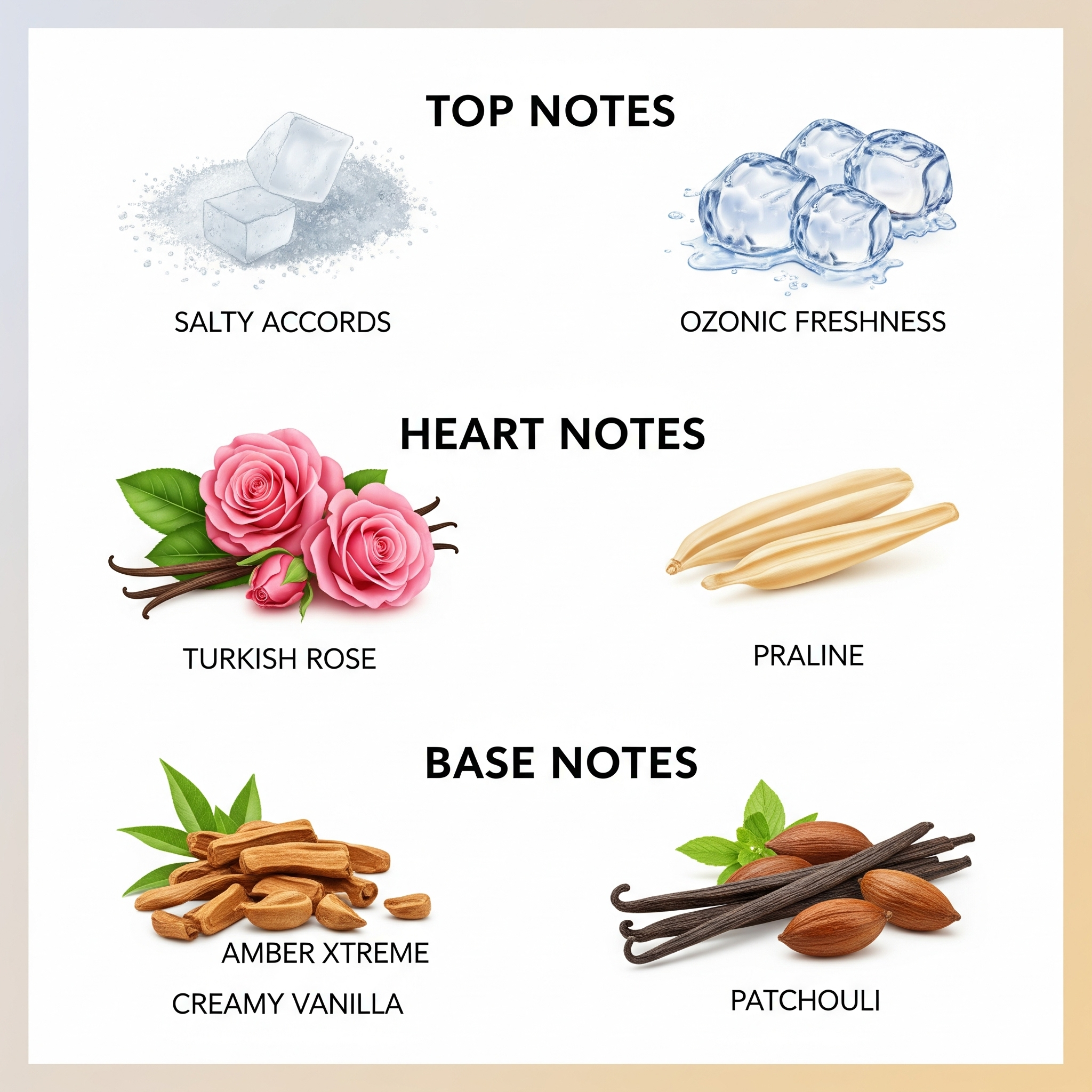 The scent begins with a fresh, invigorating blend of salty accords and ozonic notes, evoking cool ocean air and crisp energy. The heart unfolds into a romantic fusion of Turkish Rose and sweet Praline, delivering warmth, sweetness, and a soft, floral embrace. The base leaves a deep and lasting trail of Amber Xtreme, Creamy Vanilla, and earthy Patchouli, creating a sensual and addictive finish.