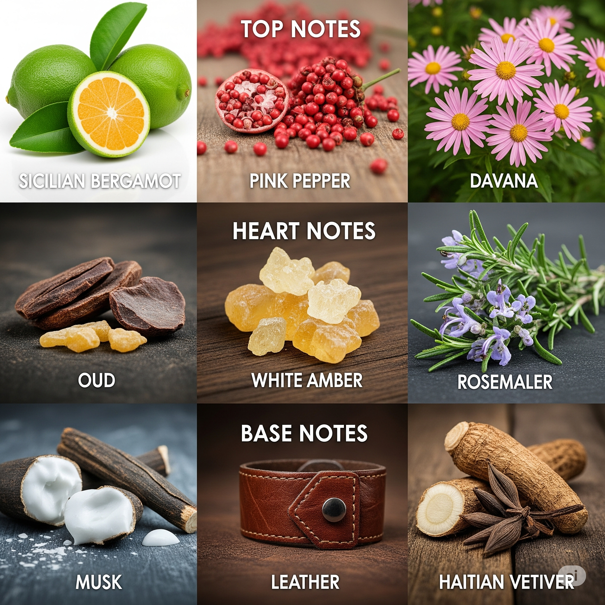 The fragrance opens with a zesty and spicy burst of Sicilian Bergamot, Pink Pepper, and Davana, offering an energizing and charismatic introduction. At the heart, a smooth yet powerful blend of Oud, White Amber, and Rosemary creates a sophisticated aromatic depth. The base notes unfold into a sensual trail of Musk, Leather, and Haitian Vetiver, leaving a lasting impression of mystery, strength, and elegance.